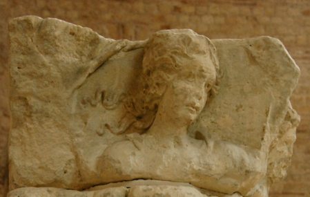 - horizontal in drei Teile zerschnitten, unten abgebr., oben beschnitten (?). Reliefs stark bestoßen.