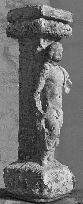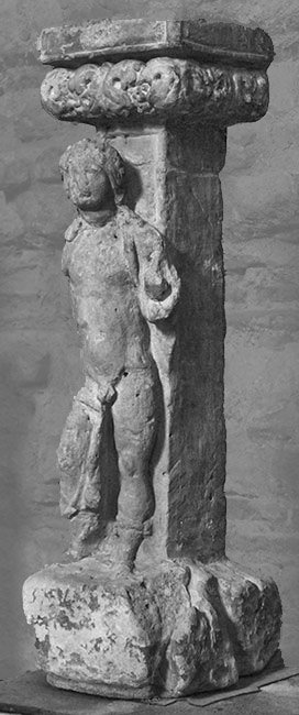 - Pfeilerförmiger Tischfuß , am viereckigen Kapitell Weinranken. vor dem Pfeiler stehender jugendlicher Dionysos (Liber Pater) mit Kranz, Mantel um linke Schulter und rechtes Bein und hohen Schuhen.