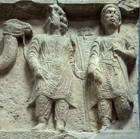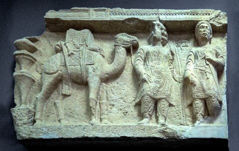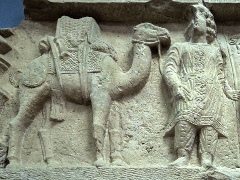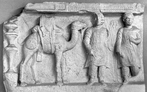 - Unter einer Kline zwei Männer in Hosen und Ärmeltunika aus gemustertem Stoff, der linke bartlos, in der Linken Speer, führt mit der Rechten ein beladenes Kamel (Dromedar). Der rechte bärtig, in der Linken Schwert (?).