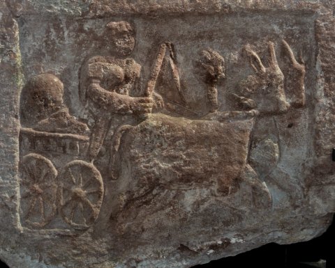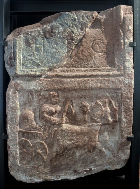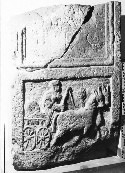 - im Sockelbild Wagenszene: beladener vierrädriger Wagen mit Zweigespann, als Lenker Soldat mit Schwert und Peitsche.