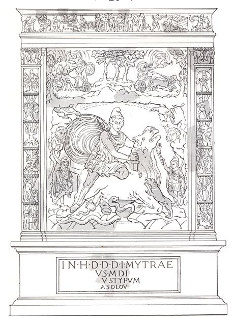- Mythos (Mithras) : Stiertötung (Tauroktonie) mit Cautes und Cautopates, Sol und Luna. Auf den Rahmenleisten weitere Mithrasszenen.