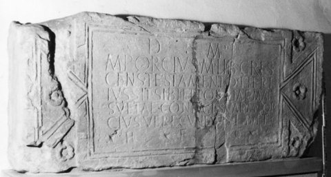 - D(is) M(anibus) / M(arcus) Porcius M(arci) lib(ertus) Cres/cens testamento fieri / iussit sibi et Porciae Man/suetae coniugi suae M(arcus) Por/cius Verecundus lib(ertus) et / h(eres) f(aciendum) c(uravit)