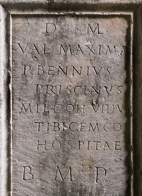 - D(is) M(anibus) / Val(eriae) Maximae / P(ublius) Bennius / Priscianus / mil(es) coh(ortis) VIII vol(untariorum) / tibicem(!) co(n)s(ularis) / hospitae / b(ene) m(erenti) p(osuit)