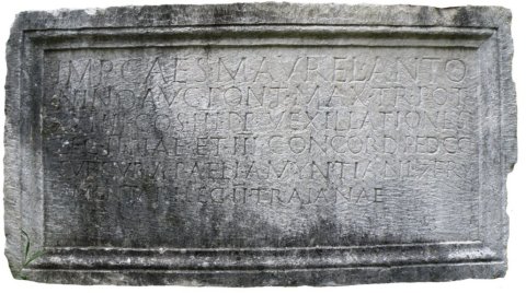- Imp(eratore) Caes(are) M(arco) Aurel(io) Anto/nino Aug(usto) pont(ifice) max(imo) tr(ibunicia) pot(estate) / XXIIII co(n)s(ule) III p(atre) p(atriae) vexillationes / leg(ionum) II piae et III Concord(iae) ped(es) CC / sub cura P(ubli) Aeli Amyntiani |(centurionis) fru/mentari(i) leg(ionis) II Traianae