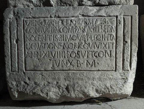 - Ven(eria?) Quartilla Aur(elio) Materno / coniugi incomparabili et in/nocentissimo vet(erano) leg(ionis) II Ita/lic(ae) natione Noric(o) qui vixit / ann(os) XLVIIII posuit con/iunx b(ene) m(erenti)