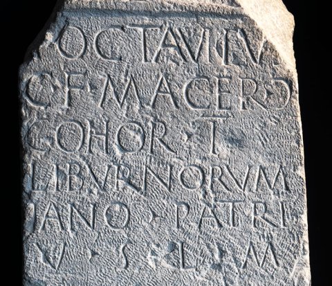 - T(itus) Octavius / C(ai) f(ilius) Macer |(centurio) / cohor(tis) I / Liburnorum / Iano Patri / v(otum) s(olvit) l(ibens) m(erito)