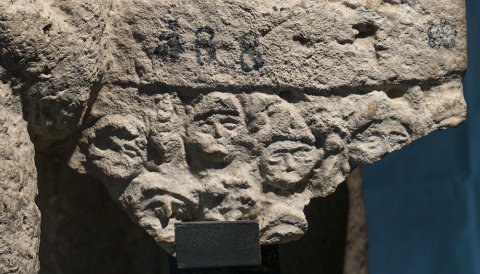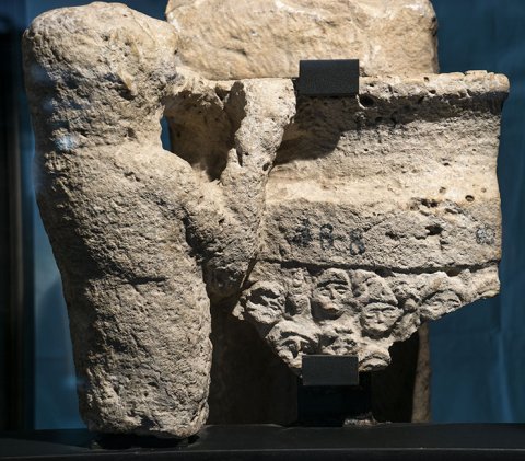 - Halsfragment mit einem Henkel in Pantherform. Auf dem oberen Rand Inschrift, darunter Reliefköpfe von einigen menschlichen Figuren.