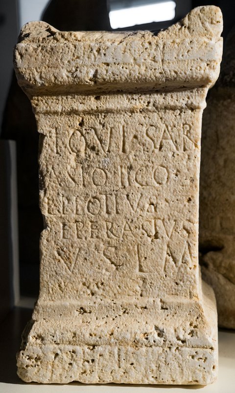 - Iovi Sab/asio Iico / L(ucius) Plotius / Eperastus / v(otum) s(olvit) l(ibens) m(erito)