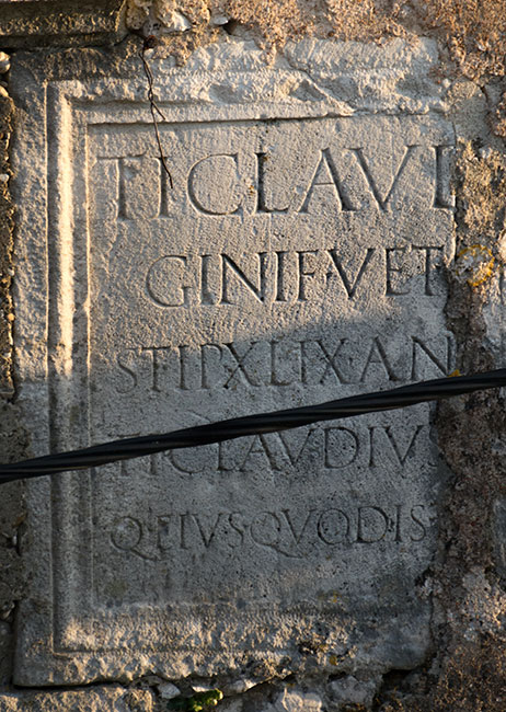 - Ti(berio) Claud[io --- ima]/ginif(ero) vet(erano) [---] / stip(endiorum) XLIX an[nor(um) ---] / Ti(berius) Claudius [--- sibi posteris]/q(ue) eius quod is t[est(amento) des(ignavit)]