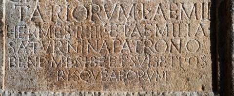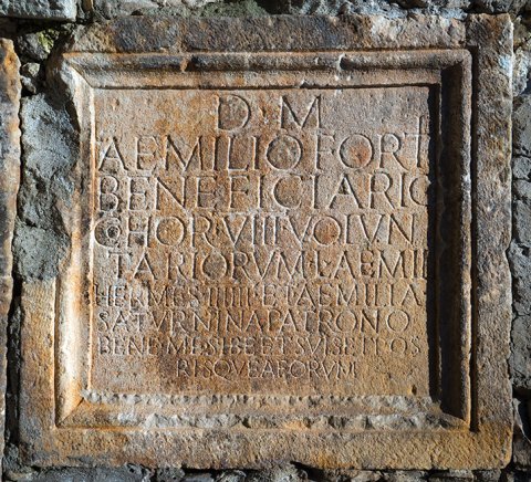 D(is) M(anibus) / Aemilio Forti / beneficiario / cohor(tis) VIII volun/tariorum L(ucius) Aemil(ius) / Hermes IIIIII(vir) et Aemilia / Saturnina patrono bene me(renti) sib<i> et suis et pos/(te)risque aeorum(!)