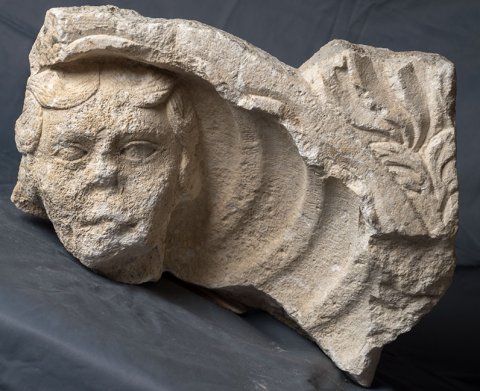 - Rest einer Muschelnische mit Porträtkopf einer Frau. Rechts Palmettenakroter.
