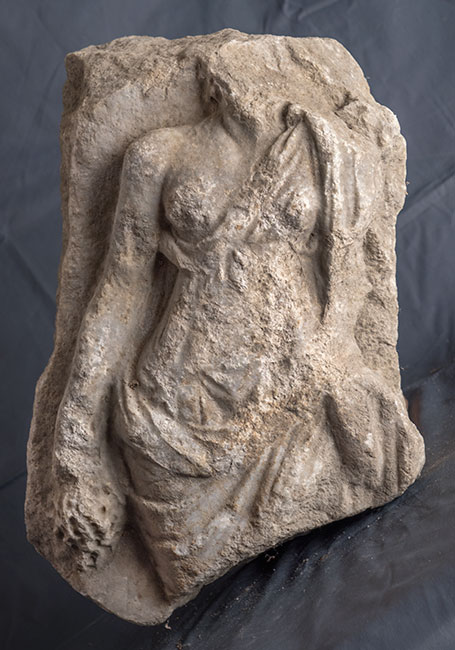 - Mythische Figur: frontal stehende Mänade in Chiton und Mantel, rechte Brust entblößt, in der Rechten Weintraube. Fragment eines attischen Sarkophages ?
