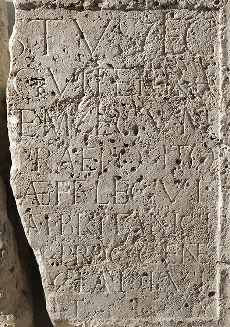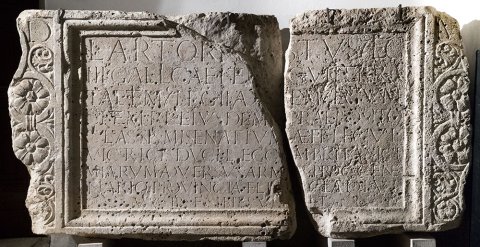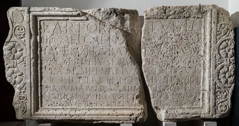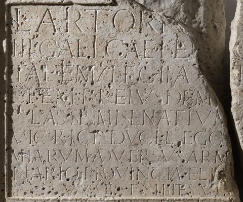 - D(is) M(anibus) // L(ucius) Artori[us Ca]stus |(centurio) leg(ionis) / III Gallicae item [|(centurio) le]g(ionis) VI ferra/tae item |(centurio) leg(ionis) II adi[ut(ricis) i]tem |(centurio) leg(ionis) V Ma/c(edonicae) item p(rimus) p(ilus) eiusdem [leg(ionis)] praeposito / classis Misenatium [pr]aef{f}(ectus) leg(ionis) VI / victricis duci(!) legg(ionum) [alaru]m Britan(n)ic{i}/{mi}arum adversus Arm[enio]s proc(urator) cente/nario(!) provinciae Lib[urniae iure] gladi(i) vi/vus ipse sibi et suis [--- ex te]st(amento)