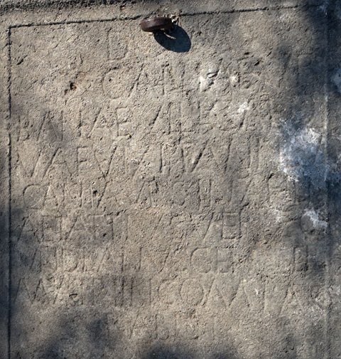 - Über dem Schriftfeld Bogenfeld mit Rosette, seitlich Blätter. Unter der Inschrift ascia.