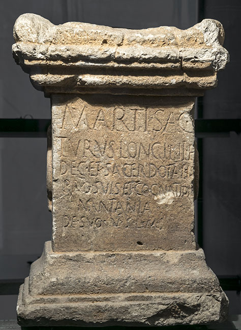 - Marti sac(rum) / Turus Longini f(ilius) / dec(urio) et sacerdotali(s) / pro suis et cognation(e) / Nantania / de suo v(otum) s(olvit) l(ibens) m(erito)