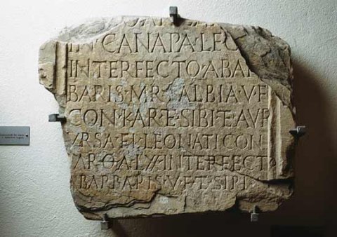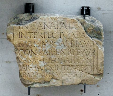 - ---] / in canapa(!) leg(ionis) / interfecto a bar/baris Mar(cia?) Salbia v(iva) f(ecit) / con(iugi) kar(issimo!) et sibi et Aur(elia) / Ursa (A)el(io) Leonati con(iugi) / kar(issimo!) o(bito) a(nnorum) LXX interfecto / a barbari(i)s v(iva) f(ecit) et sipi(!)