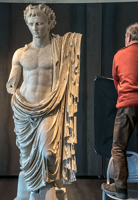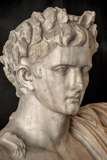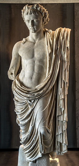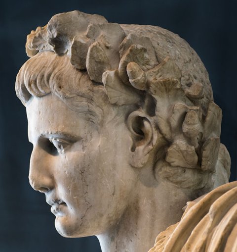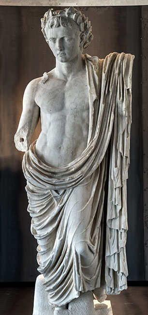 - Historische Person: Kaiser Augustus mit Eichenlaubkranz und Mantel um Hüften und linke Schulter. Postumes Porträt des Divus Augustus, Teil einer Statuengruppe mit Angehörigen der julisch-claudischen Dynastie.