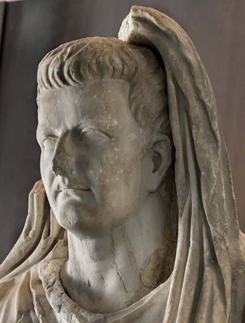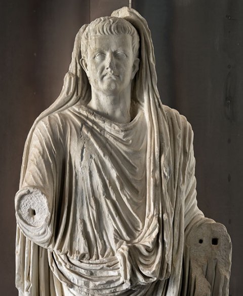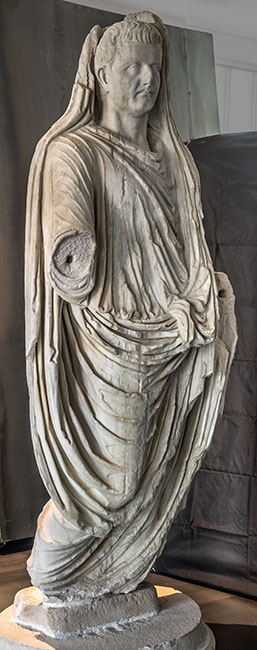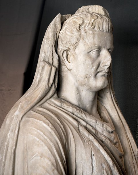 - Historische Person: Porträtstatue des Kaisers Tiberius als Togatus mit bedecktem Haupt (capite velato). Teil einer Statuengruppe mit Angehörigen der julisch-claudischen Dynastie.