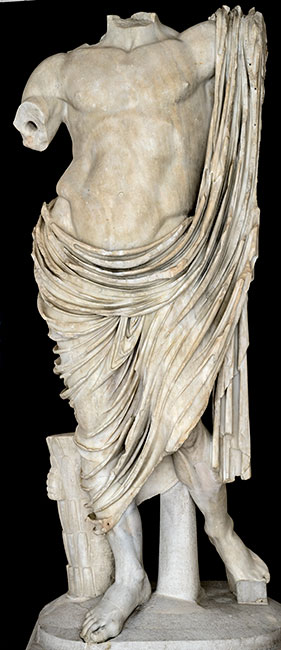 - Historische Person: Postume kolossale Porträtstatue des Divus Caesar (?), Mantel um Hüften und linke Schulter, neben dem rechten Bein Palmstammstütze. Teil einer Statuengruppe mit Angehörigen der julisch-claudischen Dynastie.
