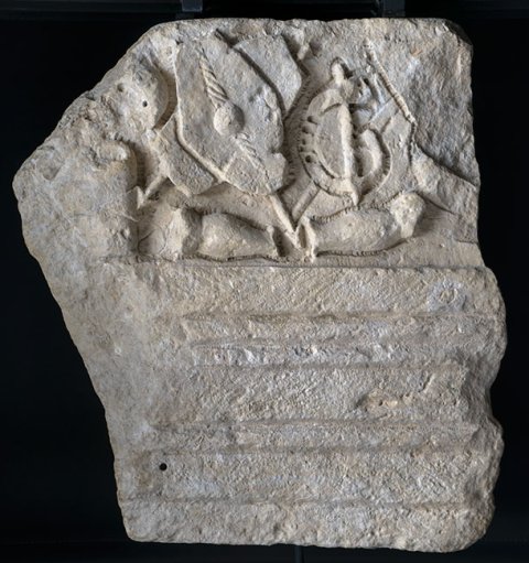- Waffen, Musikinstrument: gekreuzte Schilde und Speere, Beinschienen, Cornu