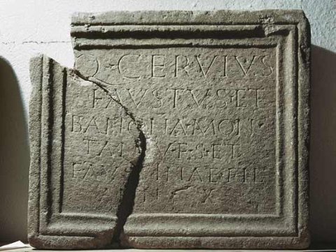 - Q(uintus) Cervius / Faustus et / Banona Mon/tani (filia) v(ivi) f(ecerunt) s(ibi) et / Faustinae fil(iae) / ann(orum) X
