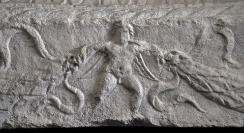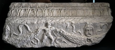 - Oben tordiertes Band und Blattkymata. Fries (Unterseite des Blockes ?) mit Girlanden tragenden Eroten, über den Girlandenbögen Theatermasken.
