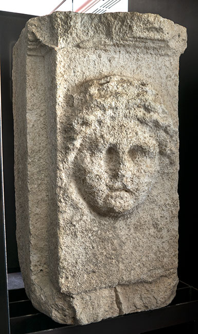 - Weiblicher Kopf mit langen Locken und Kranz (?). Mänade (?). Zwischenpfeiler einer Balustrade oder Frieses ? (zusammengehörig mit Nr. 23207).