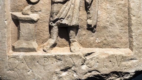- Giebel mit Blattdekor, Palmettenakrotere. Im Bildfeld stehender doppelköpfiger Janus, mit der Rechten über einem Altar opfernd, im linken Arm Füllhorn.
