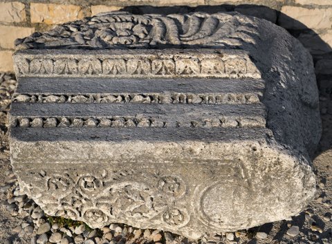 - Epistylfragment mit Rankenfries, darunter Kyma und Fascien mit Astragalstab und Eierstab (?). Soffitte mit Spiralranken in Lyraform.