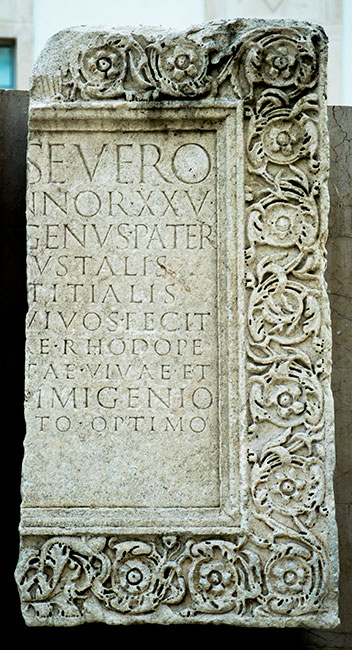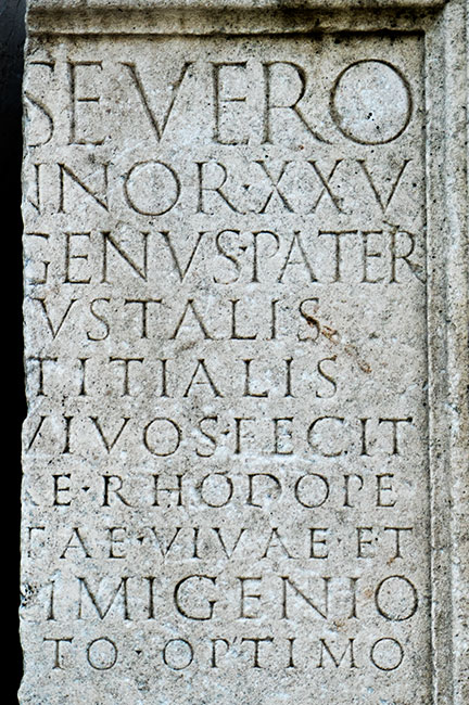 - C(aio) Vibio Severo / IIIIIIvir(o) annor(um) XXV / C(aius) Vibius Ingenu(u)s pater / IIIIII(vir) Augustalis / Flavialis Titialis / Nervialis vivos(!) fecit / et sibi et Vibiae Rhodope / uxori libertae vivae et / C(aio) Vibio Primigenio / IIIIIIvir(o) liberto optimo
