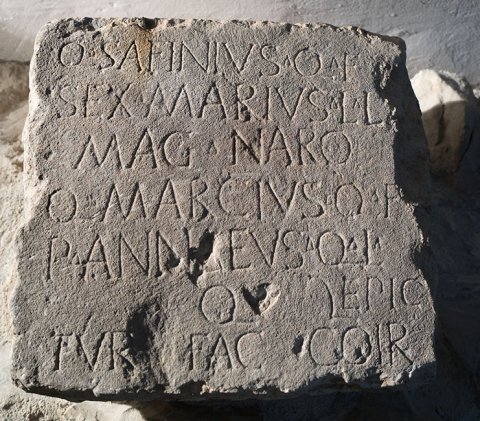 - Q(uintus) Safinius Q(uinti) f(ilius) / Sex(tus) Marius L(uci) l(ibertus) / mag(istri) Naro(nae) / Q(uintus) Marcius Q(uinti) f(ilius) / P(ublius) Annaeus Q(uinti) l(ibertus) / Epic(adus) / q(uaestores) / tur(rim) fac(iendam) coir(averunt)