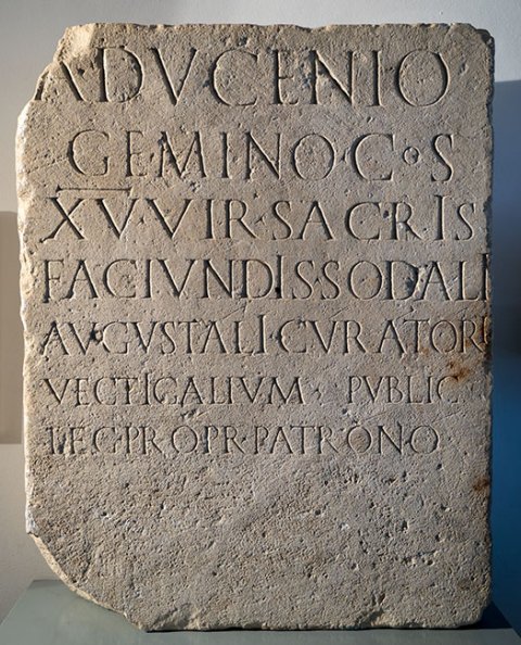 - A(ulo) Ducenio / Gemino co(n)s(uli) / XVvir(o) sacris / faciundis sodali / Augustali curatori / vectigalium public(orum) / leg(ato) pro pr(aetore) patrono