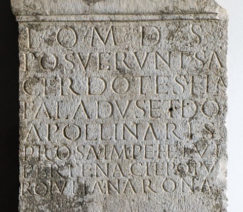 - I(ovi) O(ptimo) M(aximo) D(olicheno) s(acrum) / posuerunt sa/cerdotes Fla(vius) / Faladus et Do(mitius) / Apollinaris / pro sa(lute) Impe(ratoris) Helvi / Pertenaci(s)(!) et popul(i) / ro(loniae)(!?) Iuliae Naronae