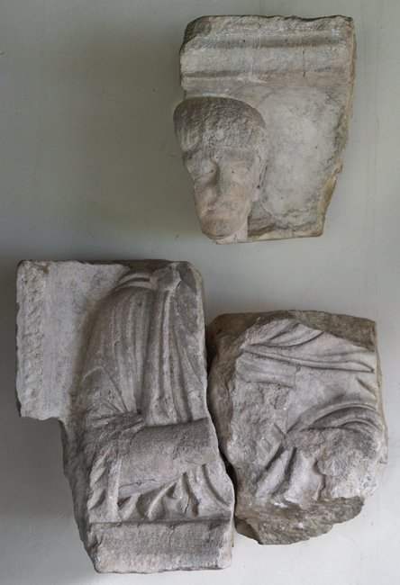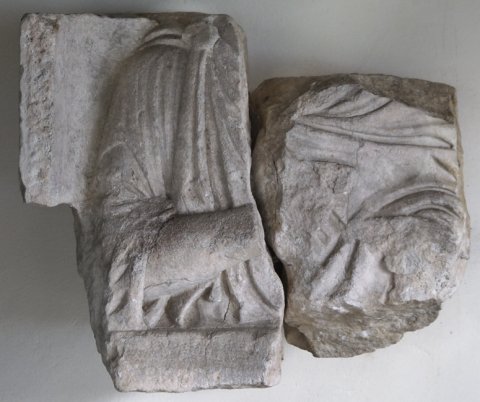 - 3 Fragmente mit Rand oben. Früher falsch zusammengesetzt, 2004/05 restauriert und wieder im Kirchenvorbau angebracht.
