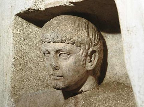 - Kopfloses Brustbild eines Mannes mit Ärmeltunica, Sagum, Scheibenfibel. Kopf eines bartlosen Jünglings.