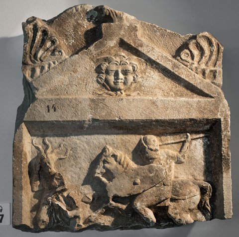 - Giebel mit Gorgoneion und Palmettenakroteren. Im Bildfeld Reiter (Soldat) mit Waffen (Helm, Schild, Speer) bei der Verfolgung einer Frau und eines Kindes.