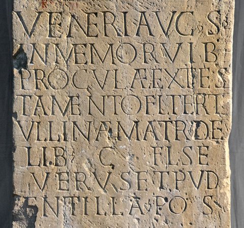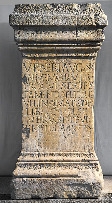 - Veneri Aug(ustae) s(acrum) / in memor(iam) Vib(iae) / Proculae ex tes/tamento Fl(aviae) Tert/ullinae matr(is) de / lib(ris) C Fl(avii) Se/verus et Pud/entilla pos(uerunt)