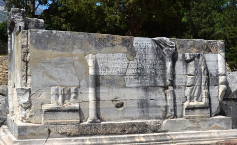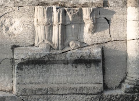 - Sarkophag mit Säulen an den vier Ecken. In der Mitte der Vorderwand und auf den Nebenseiten Bogen unter offenem Giebel auf Säulen. In den seitlichen Interkolumnien links Frau, rechts Togatus mit Rollenbündel, beide auf Podesten stehend.