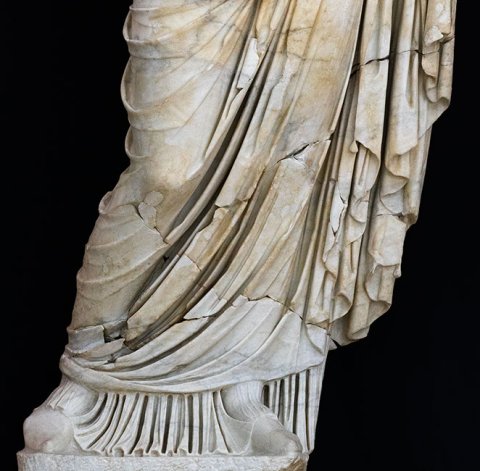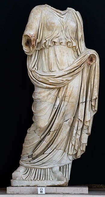 - Kopf, rechter Unteram, linke Hand fehlen, aus Fragmenten zusammengesetzt