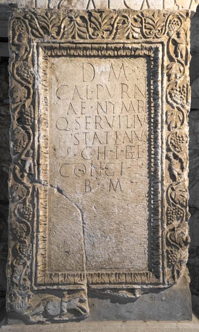 - D(is) M(anibus) / Calpurni/ae Nymphae / Q(uintus) Servilius / Statianus / |(centurio) coh(ortis) I Belg(arum) / coniugi / b(ene) m(erenti)