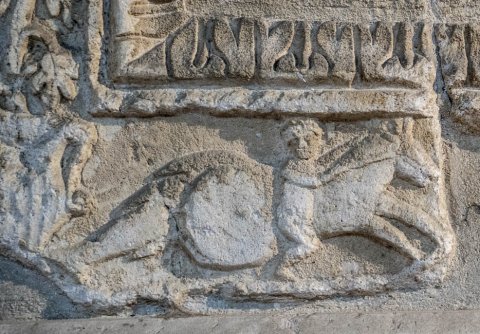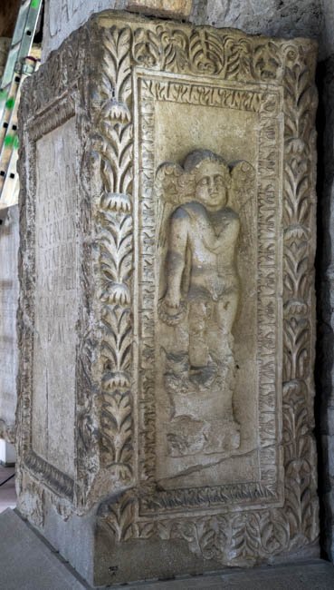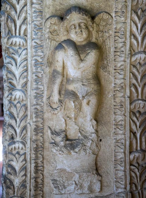 - Auf den Rahmenleisten der Vorderseite seitlich Weinranken mit Eroten, oben Palmettenfries, unten Meerwesen (Hippocamp und Knabe). Auf den Nebenseiten Trauergenius, auf den Rahmenleisten Kandelaberornament. Um Schriftfeld und Nebenseitenreliefs Kymation.