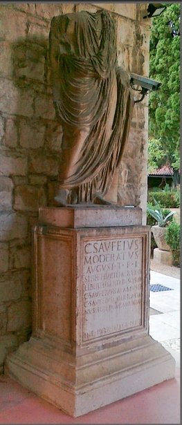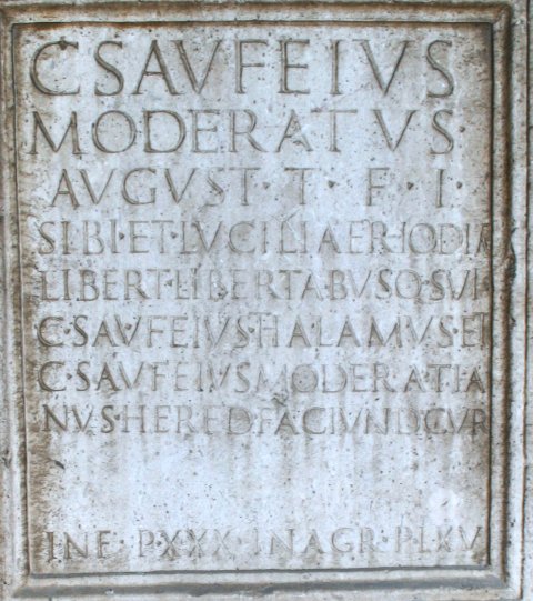 - C(aius) Saufeius / Moderatus / August(alis) t(estamento) f(ieri) i(ussit) / sibi et Luciliae Rhodiae / libert(is) libertabusq(ue) suis / C(aius) Saufeius Thalamus et / C(aius) Saufeius Moderatia/nus hered(es) faciund(um) cur(averunt) / in f(ronte) p(edes) XXX in agr(o) p(edes) LXV