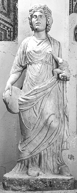 - Mythische Figur, Musikinstrument: Frau in Chiton und Mantel, mit Weinlaub im Haar und Band mit Efeudolden um den Kopf (Mänade ?). Im linken Arm nacktes Kind (Knabe), in der Rechten Tympanon.