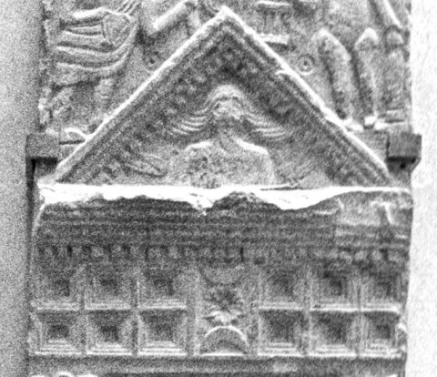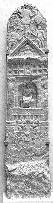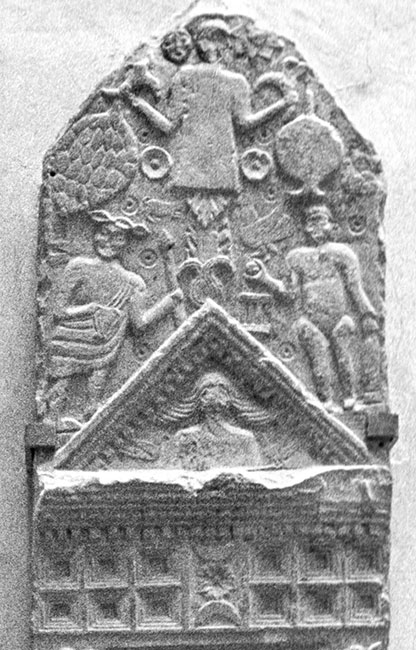 - Ganz oben Gottheiten (Genius (?) mit Traube und Granatapfel, darunter Dionysos mit Kantharos und Thyrsos, Venus mit Apfel). Giebel mit weiblicher Büste, darunter Kassettendecke mit Rosette zwischen Mondsicheln im Mittelfeld, Bogennische zwischen Säulen, sitzender Mann, unter seinen Füßen Tafel mit Inschrift, getragen von zwei nackten Atlanten. Im Sockelbild Girlande, Stier und Opferdiener.