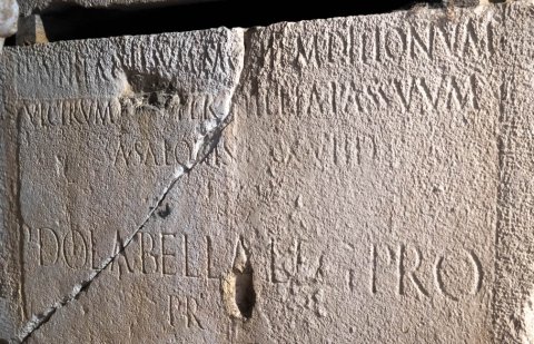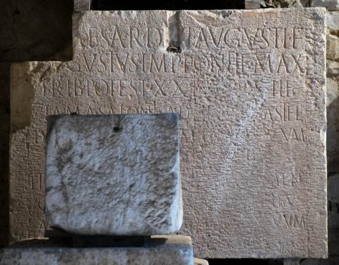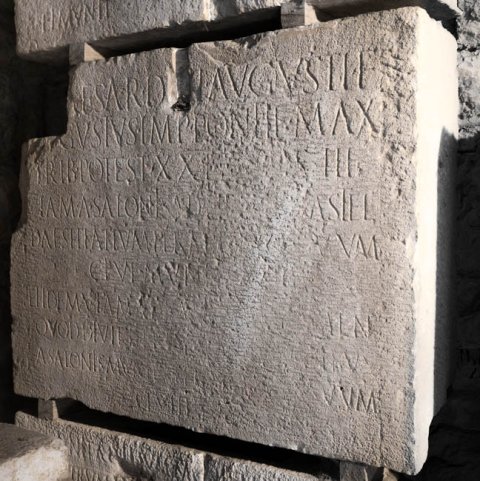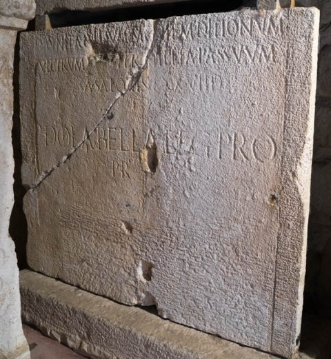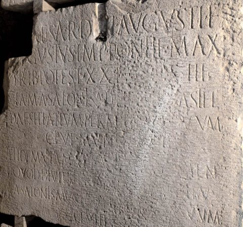 - [Ti(berius) C]aesar divi Augusti f(ilius) / [A]ugustus imp(erator) pontif(ex) max(imus) / trib(unicia) potest(ate) XXI co(n)s(ul) III / viam a Salonis ad Hedum castel(lum) / Daesitiatium per mill[i]a(!) passuum / CLVI munit / et idem viam ad Batinum flumen / quod dividit Breuc[o]s Oseriatibus / a Salonis munit per mi[lli]a(!) passuum / CLVIII / [et idem viam ---] / munit ad imum montem Ditionum / Ulcirum per millia(!) passuum / a Salonis LXXVIID / P(ublio) Dolabella leg(ato) pro / pr(aetore)