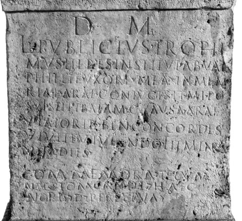 - D(is) M(anibus) / L(ucius) Publicius Trophi/mus heres institut(us) ab Val(eria) / Philete uxore mea in memo/ria(m) karae coniugis et mi po/sui stilibatam causa arae / viatorib(us) bene concordes / vivite vivendo fit minus / una dies / commemora tecum / nil stomac(h)andi haec / nobis d(omus) perpetua