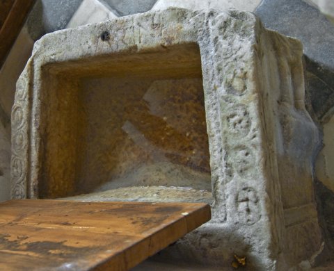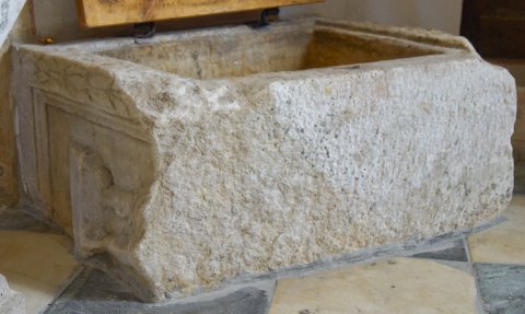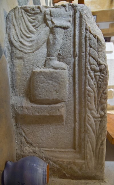 Auf der linken Nebenseite Diener (Librarius - Scriba): auf Podest Mann in kurzer Tunica und hohen Schuhen, linker Fuß auf Rollenbehälter gestellt, auf dem Knie offene Rolle (volumen). Auf dem Rahmen Pflanzenornament.