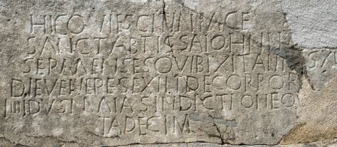 - Hic quiescit in pace / sanct(a) abtissa Iohanna / Sermenses qui bixit(!) annus(!) XL / die Veneres(!) exiit de corpore / IIII Idus Maias indictione qu[in?]/tadecim(a)
