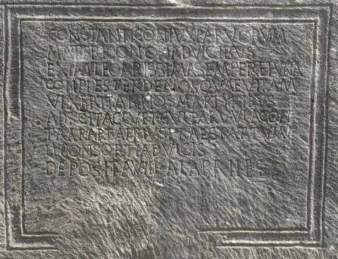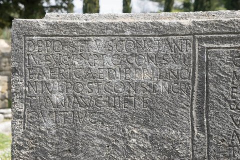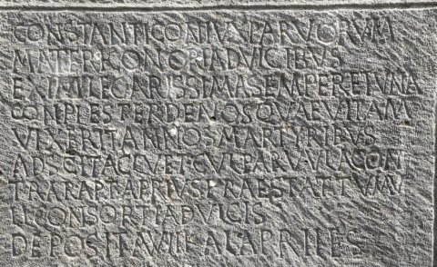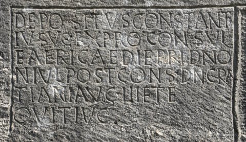 - Constanti coniux parvorum / mater Honoria dulcibus / eximie carissima semper et una / conple(n)s ter denos quae vitam / vixerit annos martiribus / adscita cluet cui parvula con/tra rapta prius praestat tumu/li consortia dulcis / deposita VII Kal(endas) Apriles // Depositus Constant/ius v(ir) c(larissimus) ex proconsul/e Africae die pridie No/n(as) Iul(ias) post cons(ulatum) d(omini) n(ostri) Gra/tiani Aug(usti) III et E/quiti v(iri) c(larissimi)