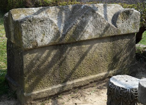 - Dachförmiger Deckel mit Eckakroteren und Mittelgiebel mit Inschrift.